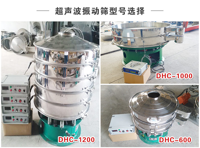 【型號選擇】—— DHC系列超聲波振動篩型號有:DHC-400、DHC-600、DHC-800、DHC-1000、DHC-1200、DHC-1500、DHC-1800、DHC-2000等八種標準直徑型號,可滿足用戶完成每小時500KG—3000KG的大中小產量篩分。