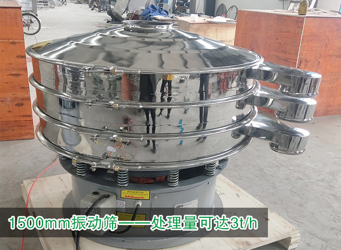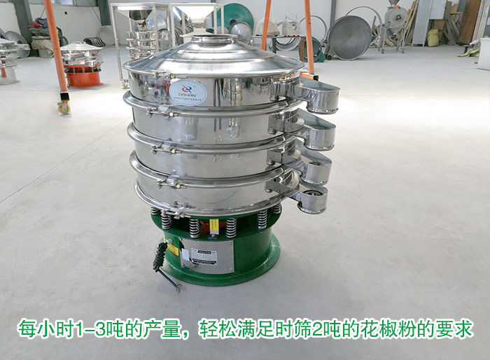 1500mm振動篩可篩1至5層篩網,能同時將花椒粉進行2至6個等級的篩選分級,雜質、粗料自動化排出,處理量可達1-3t/h。