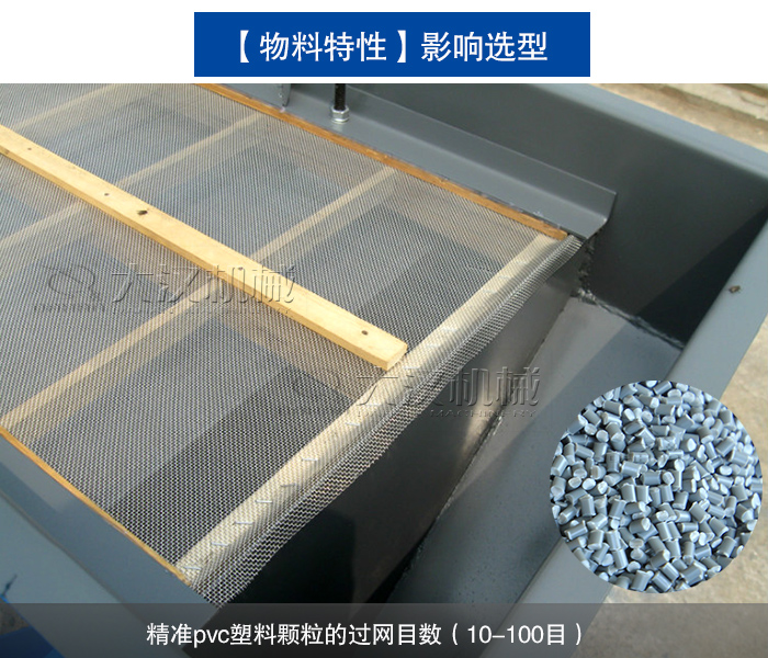 用戶對pvc塑料顆粒直線振動篩的過網目數(孔徑)也是pvc塑料顆粒直線振動篩選型的重要參考之一,pvc塑料顆粒從10-100目的大小不等,篩孔越大產量就越高,篩網目數大篩孔就小,所以相對于目數小的就不容易過網,從而造成堵網現象。因為過網目數的不同在一定程度上也會影響pvc塑料顆粒直線振動篩選型,所以只有您提供了精準的過網目數,大漢才能為您精準選型。