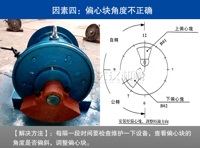 【解決方法】:每隔一段時間要檢查維護一下設備,查看偏心塊的角度是否偏斜,調整偏心塊。
