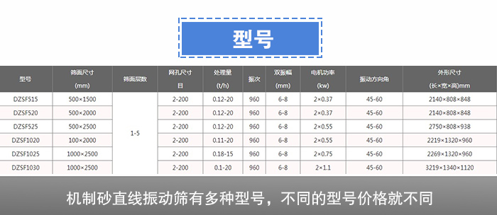 機制砂直線振動篩的型號有:DZSF-515、DZSF-520、DZSF-1020、DZSF-1025、DZSF-1030、DZSF-1035、DZSF-1540等型號,型號越大價格就會越貴,每個型號的直線振動篩都能安裝1-5層的篩網,單層可以進行簡單的篩分、過濾工作,多層可以滿足除雜、分級等不同規格物料的篩分。不同型號滿足不同用戶對于機制砂篩分的需求。