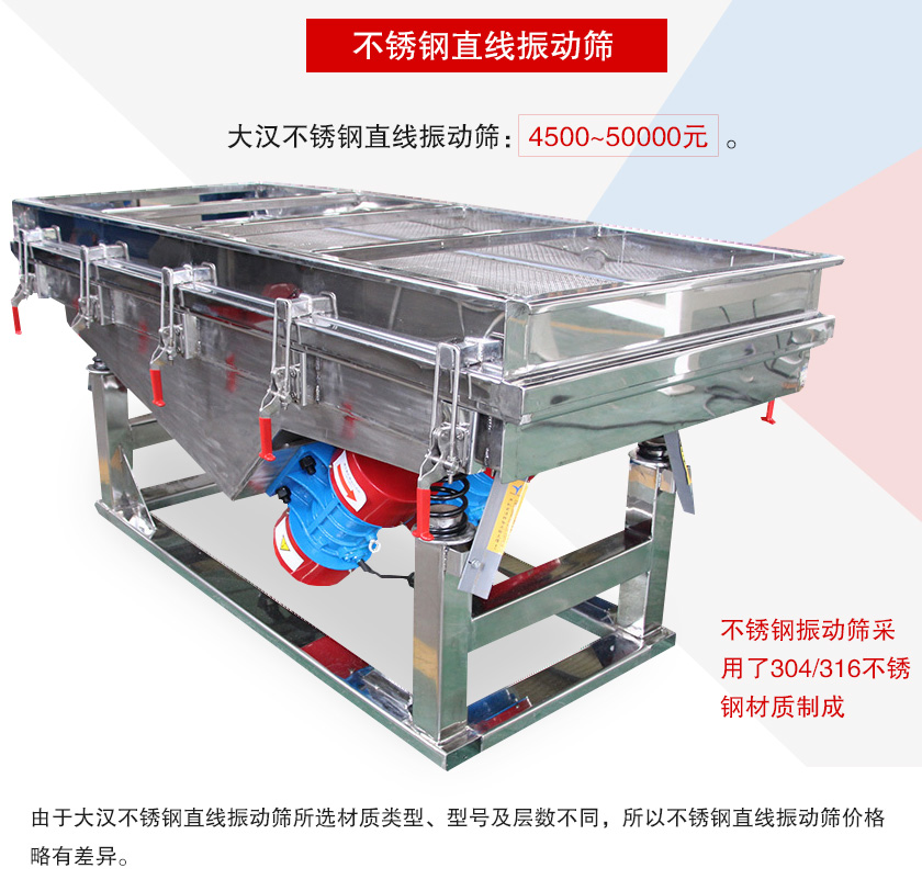 由于大漢不銹鋼直線振動篩所選材質類型、型號及層數不同,所以不銹鋼直線振動篩價格略有差異。以下即是相關介紹。