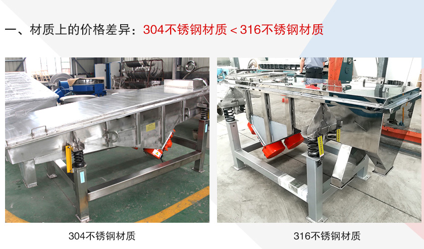 大漢不銹鋼直線振動篩材質主要有304和316兩種不同的選擇,這兩者的區別在于316不銹鋼材質比304不銹鋼材質更耐腐蝕,能抵抗更高的溫度,但是其價格會比304不銹鋼材質貴一些,所以如果您所要篩分的物料溫度和酸堿性一般,還是建議您選擇304不銹鋼直線振動篩。
