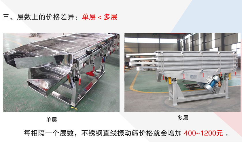 不銹鋼直線振動篩篩面層數可至5層,單層用于除雜,多層用于分選不同粒度規格的物料,主要是按照用戶自身的篩分目的來選擇,層數越高,制造成本就越大,所以價格一般就會越貴,在材質、型號相同情況下,每相隔一個層數,不銹鋼直線振動篩價格就會增加400~1200元。