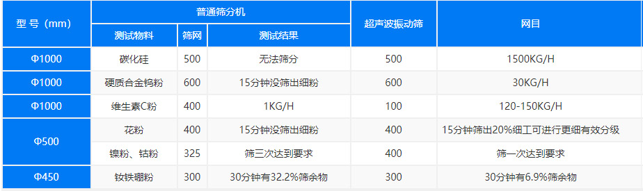 超聲波振動篩的常規型號有直徑600mm、直徑800mm、直徑1000mm、直徑1200mm、直徑1500mm等。不同種直徑的旋振篩篩分的物料量、目數也不同。舉個例子,直徑600型超聲波振動篩測試物料花粉,篩網目數400目,15分鐘篩出20%的細粉,并可以進行更細有效分級。