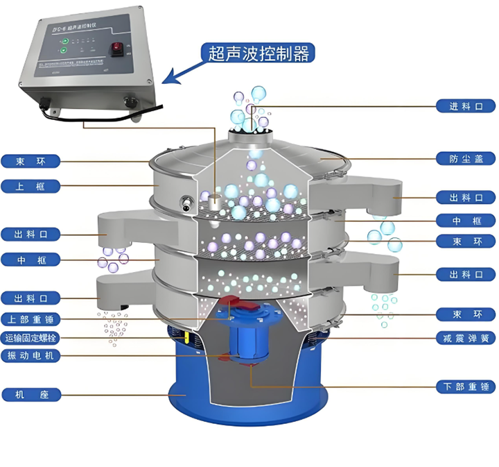 超聲波振動篩廠家生產的通用結構是振動源、篩箱、篩網、超聲波系統(tǒng)及減震裝置等。振動源為物料輸送供能;篩箱是物料篩分核心空間,內部裝有200目或500目等不同目數(shù)的篩網,篩網通過專用張緊裝置固定以保穩(wěn)定;超聲波系統(tǒng)含超聲波發(fā)生器和換能器,換能器可破物料團聚、防堵網;減震裝置裝于設備底部,能吸收設備運行振動,減少對地面及周邊設備影響,同時保障設備穩(wěn)定運行。我廠的超聲波發(fā)生器分為內置式和外置式,并且我廠的超聲波振動篩有法蘭式,能夠使物料輸送無泄漏。