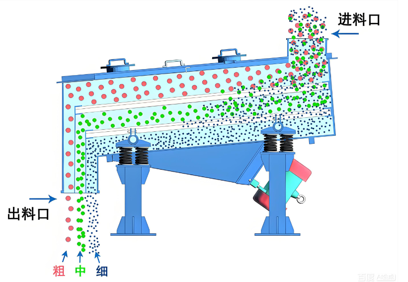 設備由篩箱、振動電機、篩網、彈跳球等多個部件構成。篩箱內置 1-5 層可快拆篩網,雙電機反向驅動產生直線激振力,減振彈簧緩沖振動,機架支持非標定制,適配各類生產線布局。