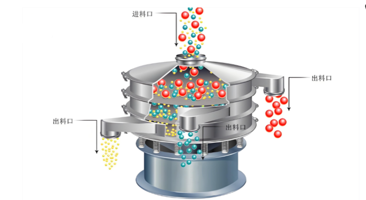 旋振篩的工作原理 主要依靠振動電機產生的激振力。當振動電機啟動后,上下偏心重錘會產生不同方向的離心力,使篩機同時產生水平、垂直和傾斜方向的復合運動。這種三維立體振動會使物料在篩面上呈螺旋狀向外擴散運動。在振動過程中,細小顆粒會通過篩網落入下層,而較大的顆粒則繼續向外運動并從粗出料口排出。