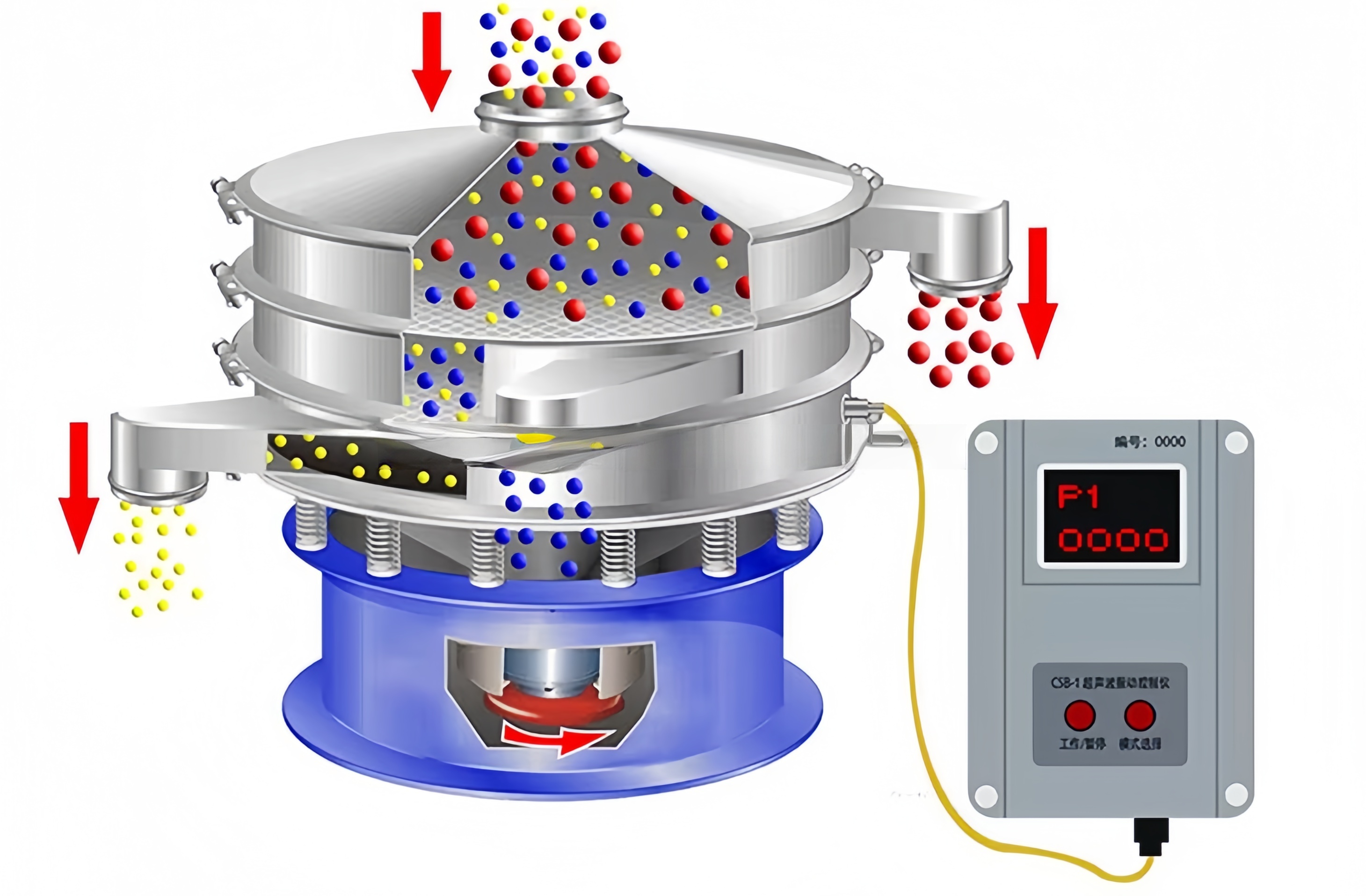 陶土超聲波振動篩整合了常規機械振動與超聲波高頻振動雙重動力,在設備啟動后,底部振動電機帶動篩體做三次元旋振運動,讓陶土物料在篩面上均勻散開、緩慢移動;與此同時,超聲波發生器將電能轉化為高頻機械振動,通過換能器傳遞至篩網表面,使篩網產生高頻低幅的微振動。這種微振動能快速打散團聚的陶土粉末,破除物料與篩網之間的粘附力,避免細粉堵塞網孔,讓合格陶土細粉順利透過篩網,不合格雜質或粗顆粒則被篩網截留,完成多規格篩分分級。